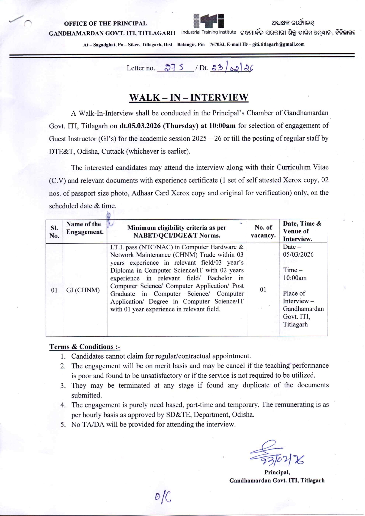 In this era of new challenges, skilled professionals are proving to be the pillars of success for our nation. Our institute is determined to produce such skilled professionals equipped with life skills. We emphasize on making sustainable atmosphere for our trainees, where they can learn and utilize their skill and knowledge for reformation of the society. With the help of dedicated & experienced faculties, we are committed to provide the best possible training to the trainees in a nursing and caring environment to optimize their growth as a professional. With many success stories spread over its 25 years of history, Gandhamardan Govt. ITI, Bolangir is continuing its journey with the aim to achieve the excellency in industrial training.